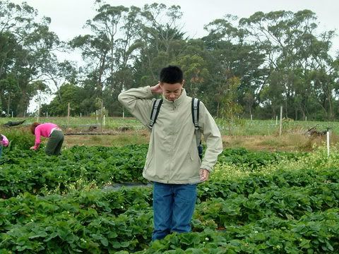 at the strawberry farm. suddenly, it was raining. so i had to take out my hood from my jacket.